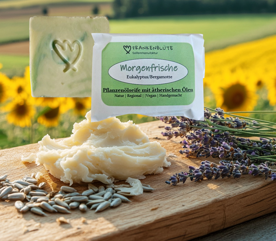 In meiner kleinen Seifenmanufaktur im fränkischen Altdorf bei Nürnberg stellen wir jede Seife liebevoll von Hand her – mit einem hohen Anteil an regionalem fränkischem Bio-Sonnenblumenöl und weiteren pflanzlichen Ölen.